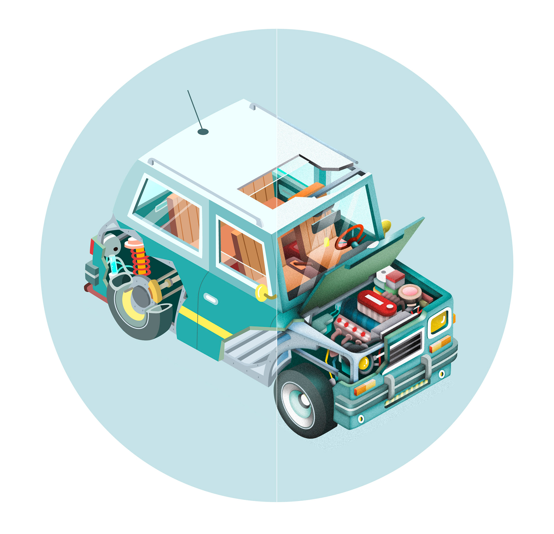 In this project the final art of the illustrations had to be flat, without volume. I hardly needed treatment in photoshop, however once the order was finished I decided for my own to give them something more volume in order to enrich the final result.